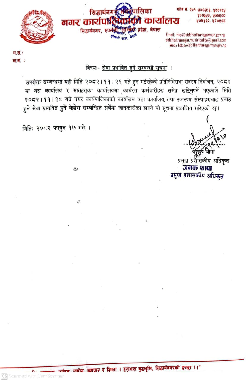 सिद्धार्थनगर नगरपालिका,नगर कार्यपालिकाको कार्यालय